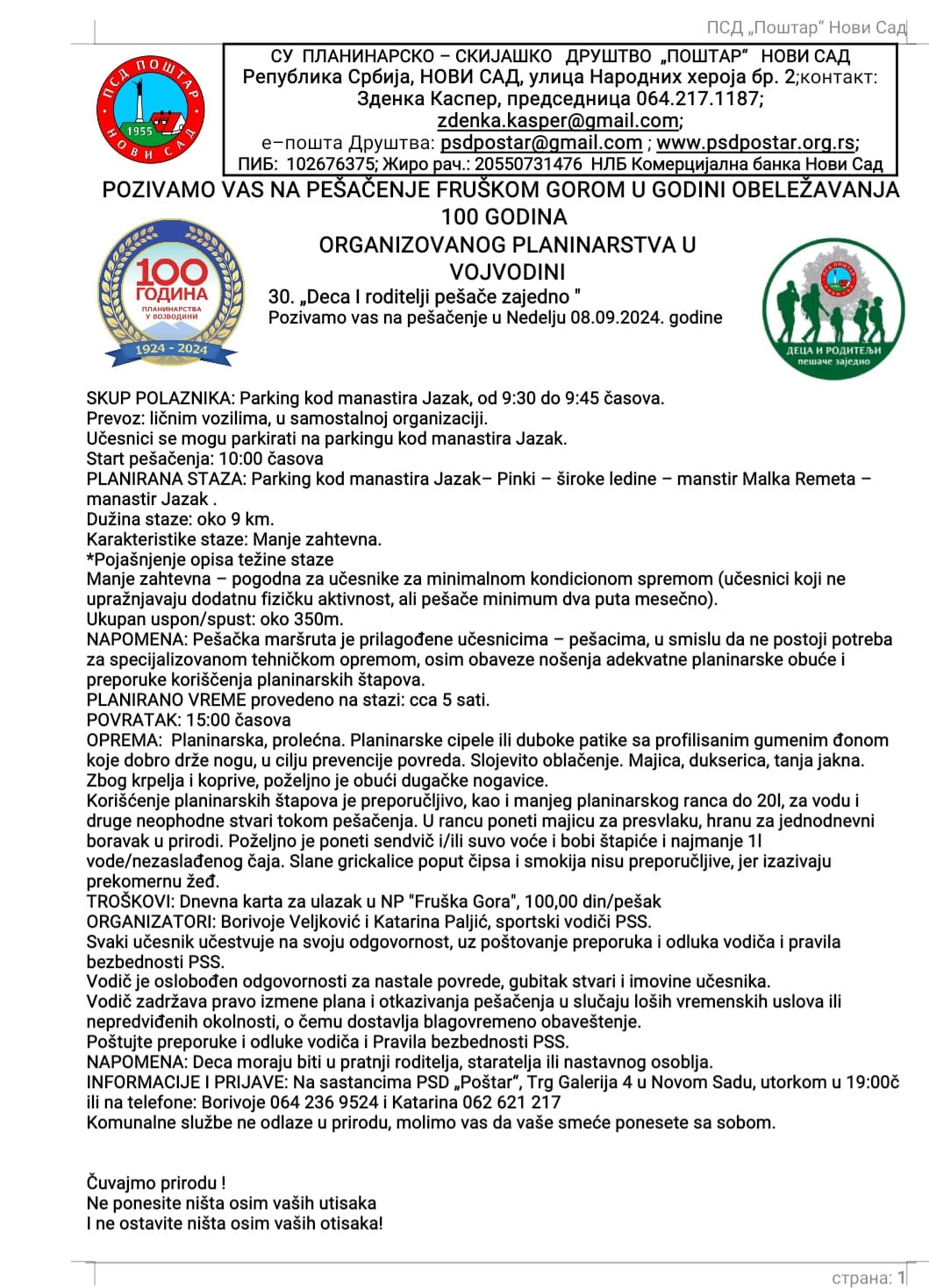 Пројекат „Деца и родитељи пешаче заједно“ покренут је 2017. године с циљем да се пешачење као здрав начин живота, боравак у природи и физичка активност представе грађанима. Одржава се четири пута годишње и окупља око сто шетача. Пешачке туре су прилагођене и најспоријим шетачима, а обогаћене су интересантним предавањима о природи, геологији, флори и фауни Фрушке горе.